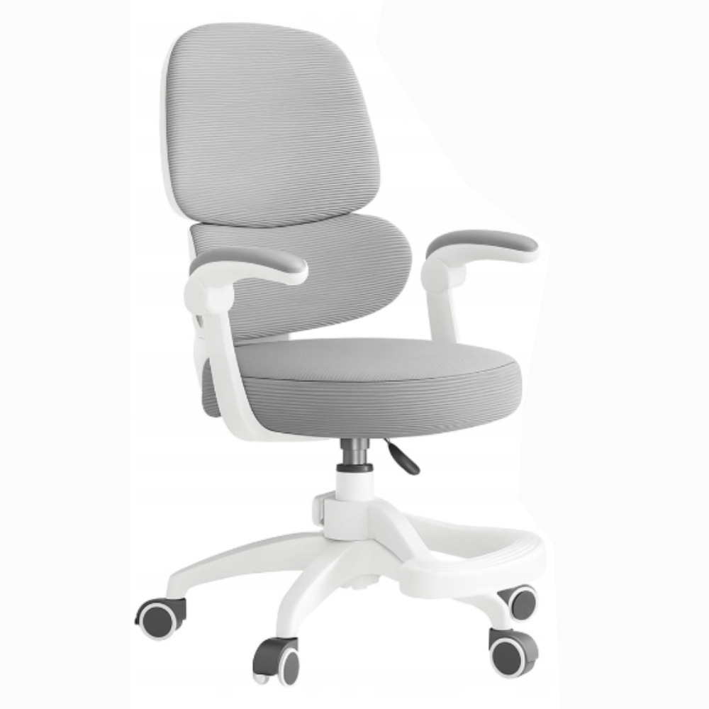 Ergonomiczne oparcie z podparciem lędźwiowym wspiera kręgosłup, a regulacja wysokości siedziska (47–56 cm) oraz oparcia (zakres 6 cm) pozwala idealnie dopasować fotel do biurka i wzrostu dziecka. Dodatkowa regulowana podstawka pod stopy (do 9 cm) zapewnia komfort najmłodszym użytkownikom, których stopy nie sięgają podłogi, stabilizując pozycję siedzenia.